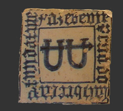 Azulejo pintado del siglo XV con leyenda "Me face vivir penando tan libre cautividad" y con la representación en el centro de un anagrama con dos grilletes.