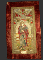 Bordado del siglo XVI para una casulla con motivo de una santa, bordado en hilo de oro y plata sobre terciopelo.