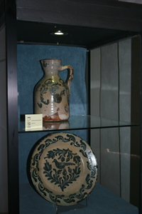 En esta vitrina se muestran como presentación de la exposición una jarra y un plato del siglo XVII de gran calidad artística y muy raros de localizar.